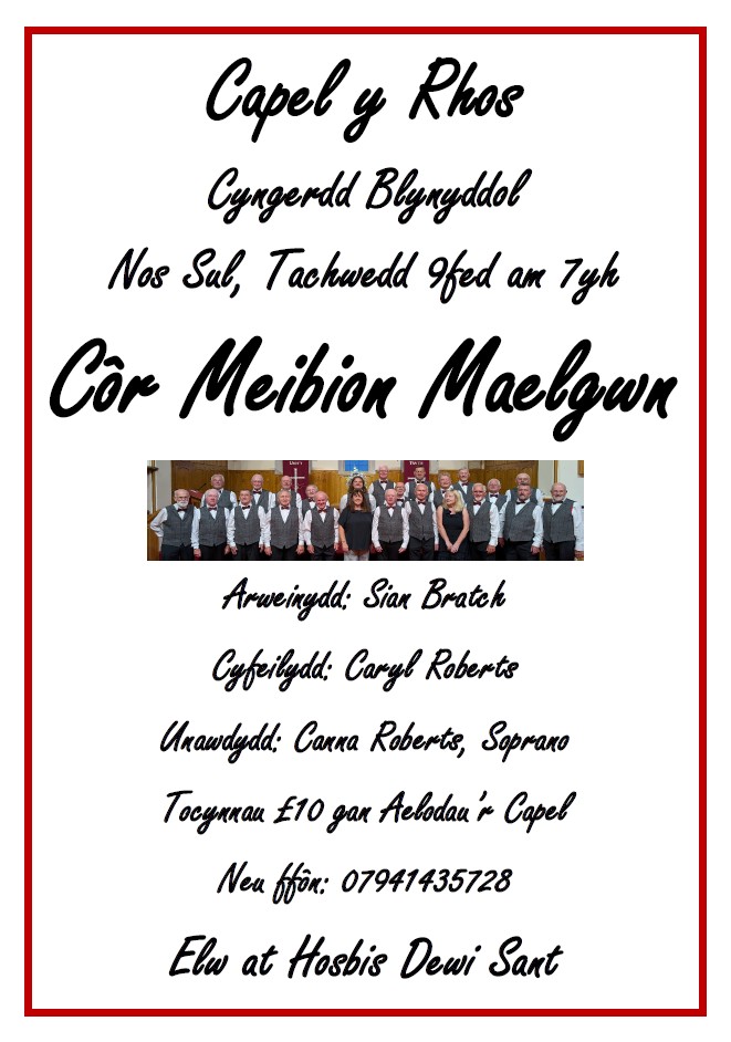Bydd Côr Meibion Maelgwn yn perfformio yn y Cyngerdd Blynyddol yng Nghapel y Rhos nos Sul, 9fed o Dachwedd. Hefyd yn ymddangos bydd Canna Roberts, Soprano talentog.