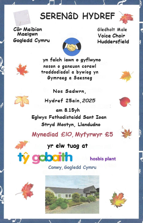 Byddwn yn perfformio cyngerdd elusennol ar ran ty gobaith yn Eglwys Sant Ioan, Llandudno ddydd Sadwrn, 25 Hydref. Yn ymuno â ni am y noson bydd Côr Meibion Gledholt o Huddersfield. Bydd y ddau Gôr yn canu eitemau o'u repertoire eu hunain, ond hefyd yn cyfuno ein lleisiau ar gyfer cwpl o berfformiadau cyffrous!
